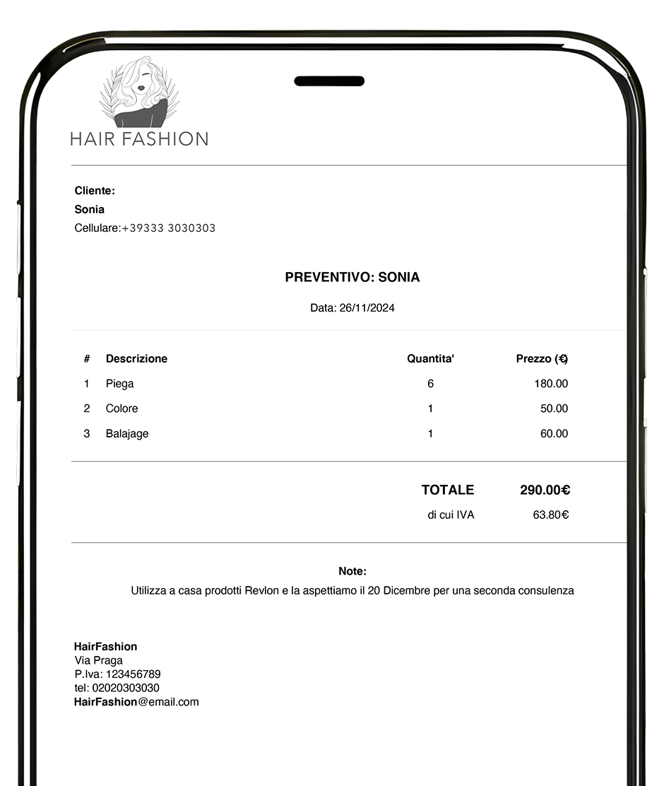 È possibile creare preventivi dettagliati direttamente dal software, includendo servizi, prodotti e sconti personalizzati, e inviarli in formato PDF tramite WhatsApp con pochi clic.